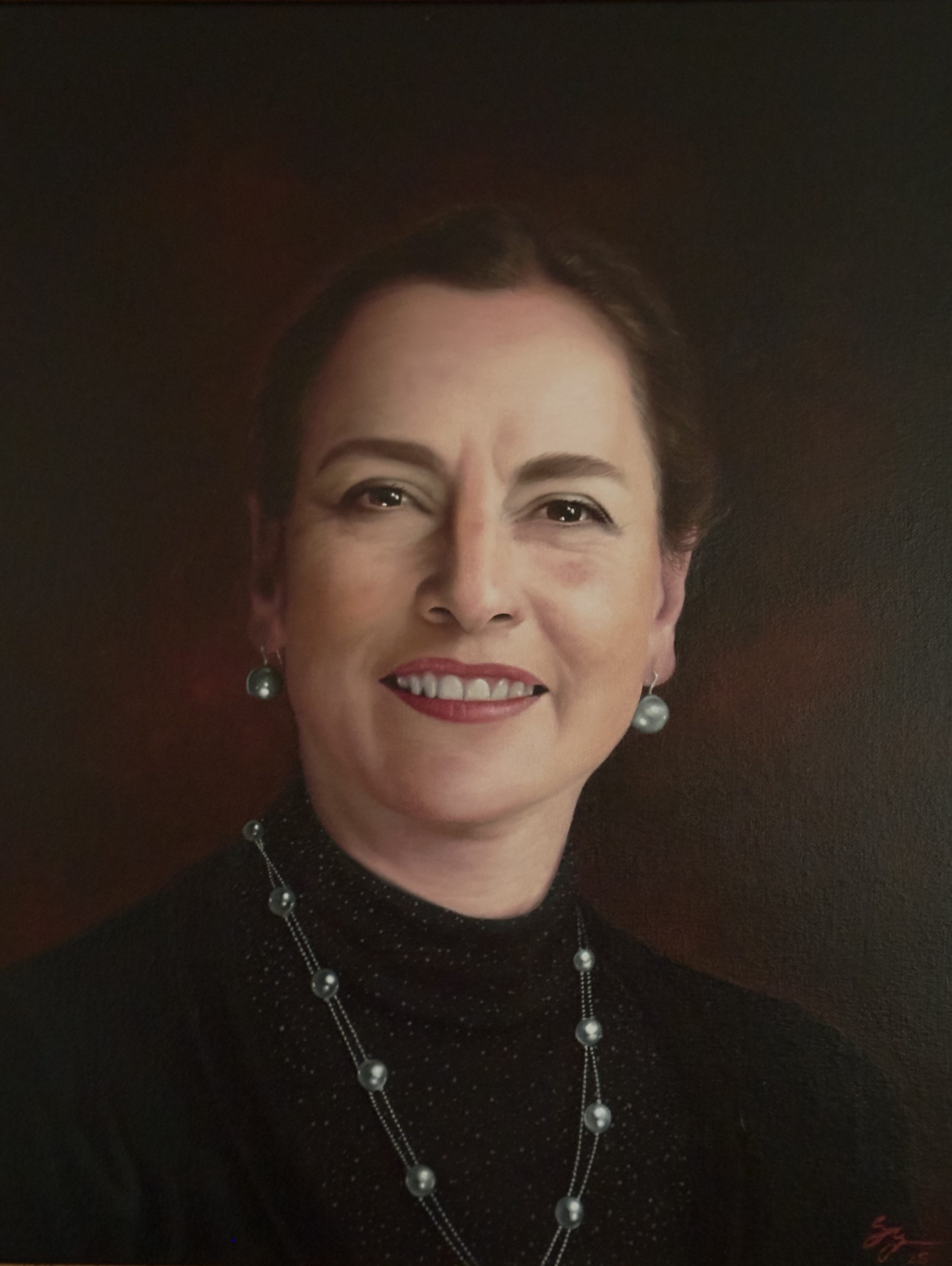 Una atmósfera de distinción intelectual envuelve este magnífico retrato firmado por el maestro Sergio González, quien nos entrega una representación de la doctora Beatriz Gutiérrez Müller ejecutada con una delicadeza técnica que roza la perfección. Lejos de la frialdad académica, la obra respira vida gracias a un tratamiento de la luz exquisitamente dirigido; la iluminación baña el rostro desde un ángulo lateral superior, esculpiendo los pómulos y la frente con una suavidad que evita los contrastes duros, logrando así que la piel irradie una calidez orgánica y verosímil. Es una pintura que no solo busca la semejanza física, sino capturar la vibración vital de la retratada.