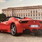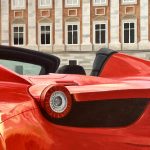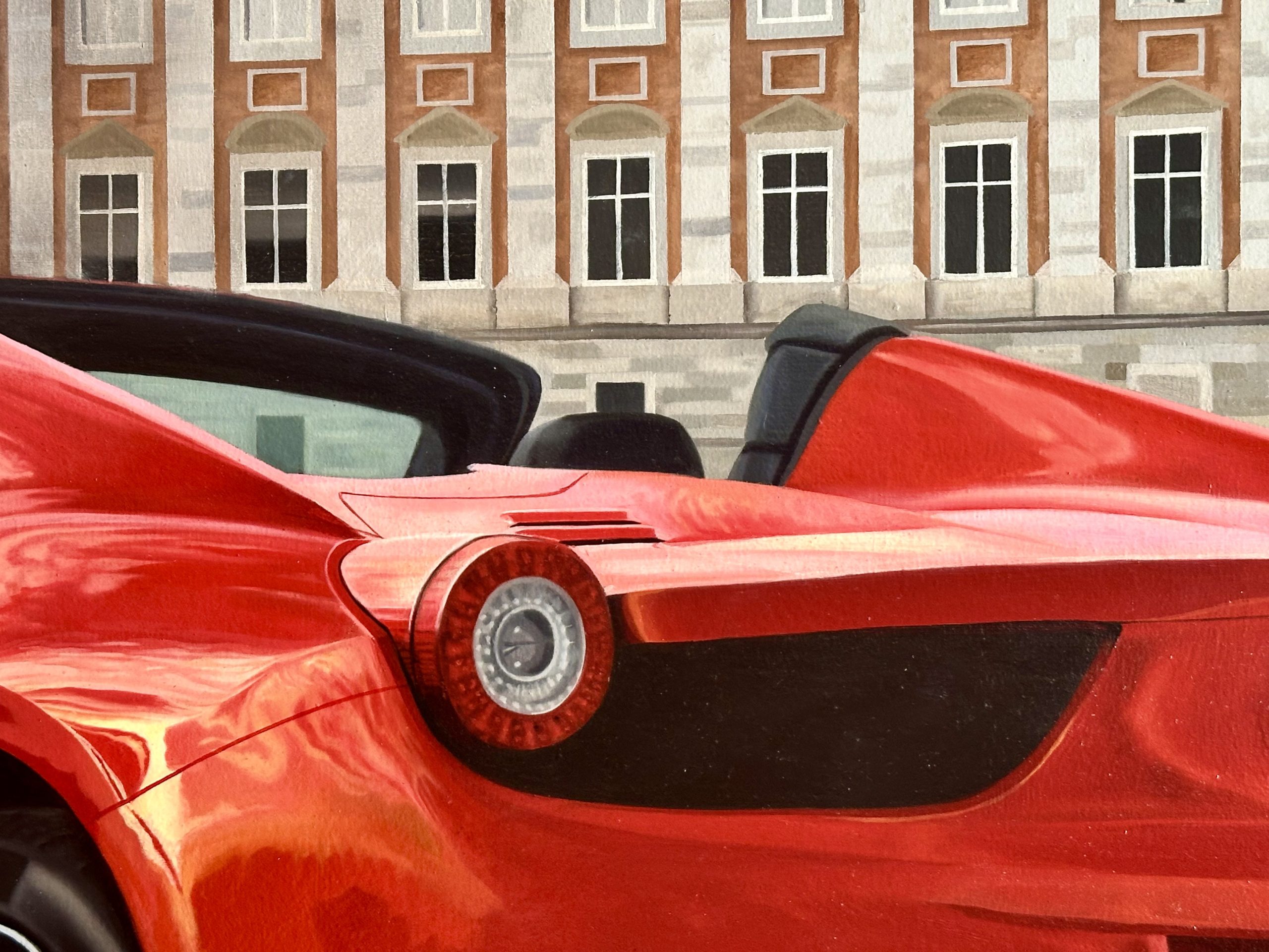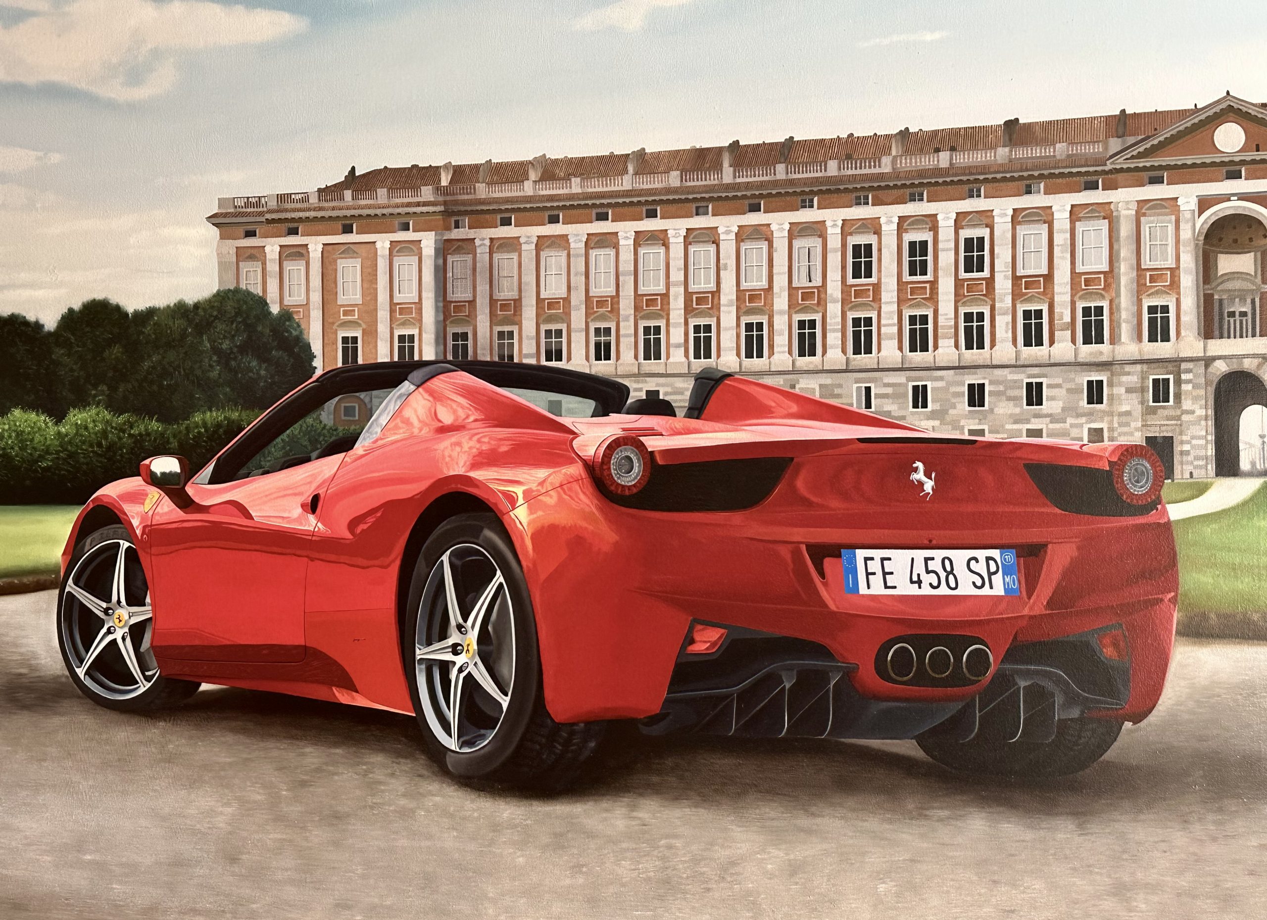 Desde una dimensión psicológica y simbólica, esta vista posterior del automóvil proyecta una narrativa de despedida y potencia latente. A diferencia de la vista frontal que confronta, el ángulo trasero sugiere movimiento, fuga y libertad; es la imagen de la velocidad que deja atrás el pasado estático representado por el edificio. La matrícula visible, «FE 458 SP», actúa como una cédula de identidad que reafirma la exclusividad del modelo, mientras que las luces traseras redondas evocan una mirada atenta y tecnológica. La obra transmite un estatus de nobleza contemporánea, equiparando la maravilla mecánica con la grandeza aristocrática del fondo.