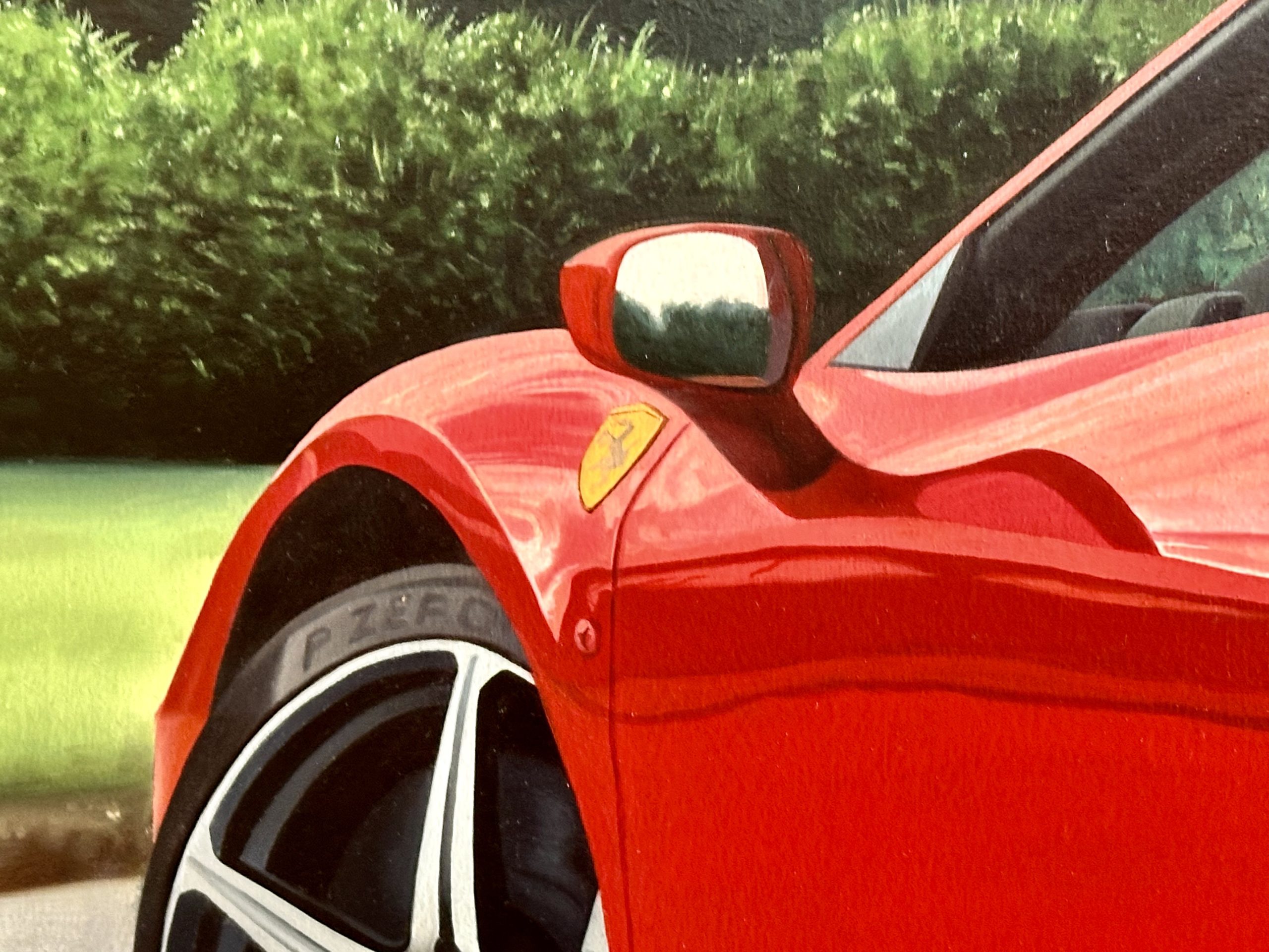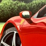 En esta magnífica incursión en el hiperrealismo técnico, el maestro Sergio Gonzalez aborda la representación del Ferrari 458 Spider desde una perspectiva que celebra la escultura cinética del automóvil. La obra se aleja de la frontalidad convencional para explorar la compleja geometría de la zaga del vehículo, donde la luz natural juega un papel crucial al deslizarse sobre las curvas de los pasos de rueda y la cubierta del motor. El tratamiento lumínico es de una sofisticación exquisita; los brillos especulares en la carrocería «Rosso Corsa» no son meros adornos, sino herramientas que modelan el volumen, otorgando una solidez casi palpable al metal y definiendo la musculatura aerodinámica de la máquina bajo un cielo de nubes dispersas.