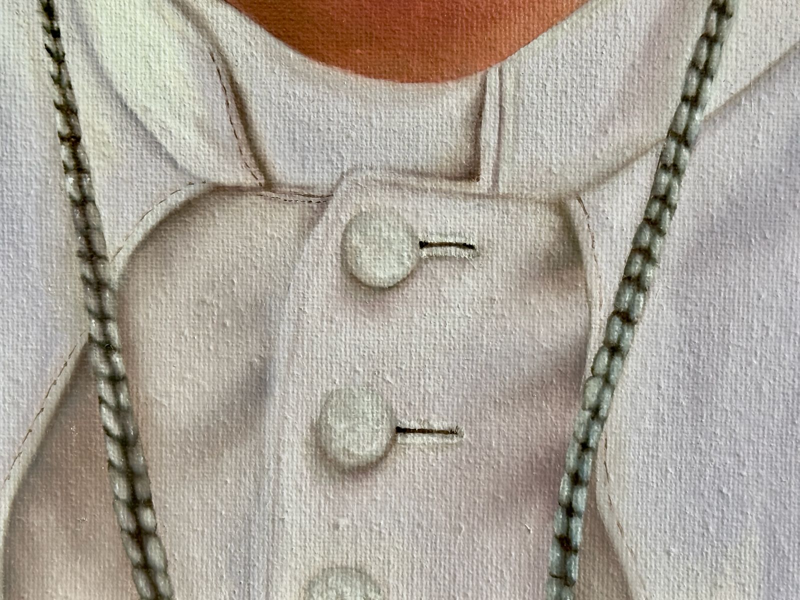 En el corazón de la dimensión psicológica y simbólica, el cuadro revela su secreto más precioso: la devoción mariana que define el pontificado de Jorge Mario Bergoglio. La expresión, de una serenidad alegre y compasiva, adquiere una profundidad teológica al descubrirse que, en la curvatura cristalina de sus pupilas, habita el reflejo nítido de la Virgen de Guadalupe. Este detalle de miniaturismo virtuoso no es solo un alarde técnico; es una declaración de identidad que vincula al primer Papa latinoamericano con la «Emperatriz de América». El artista sugiere visualmente que la mirada de Francisco hacia el mundo está mediada y protegida por la imagen de la Guadalupana, fusionando la fe universal con sus raíces continentales.